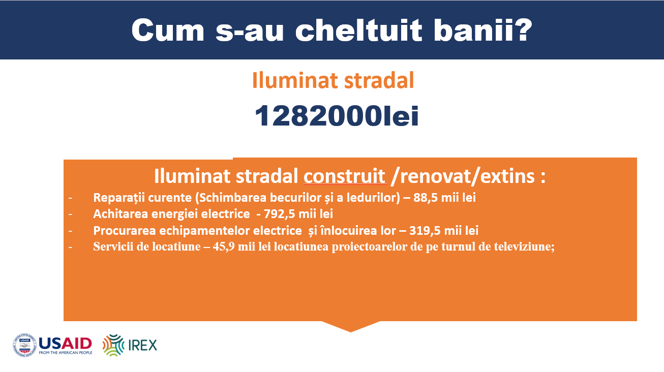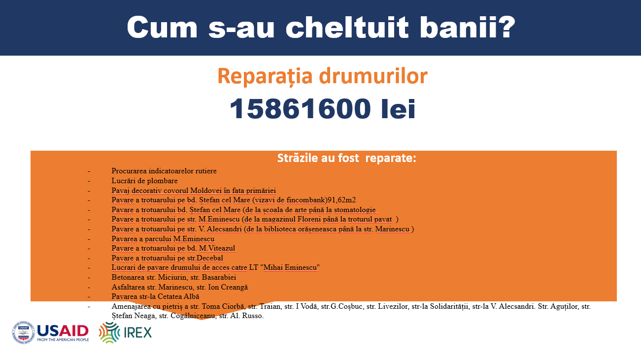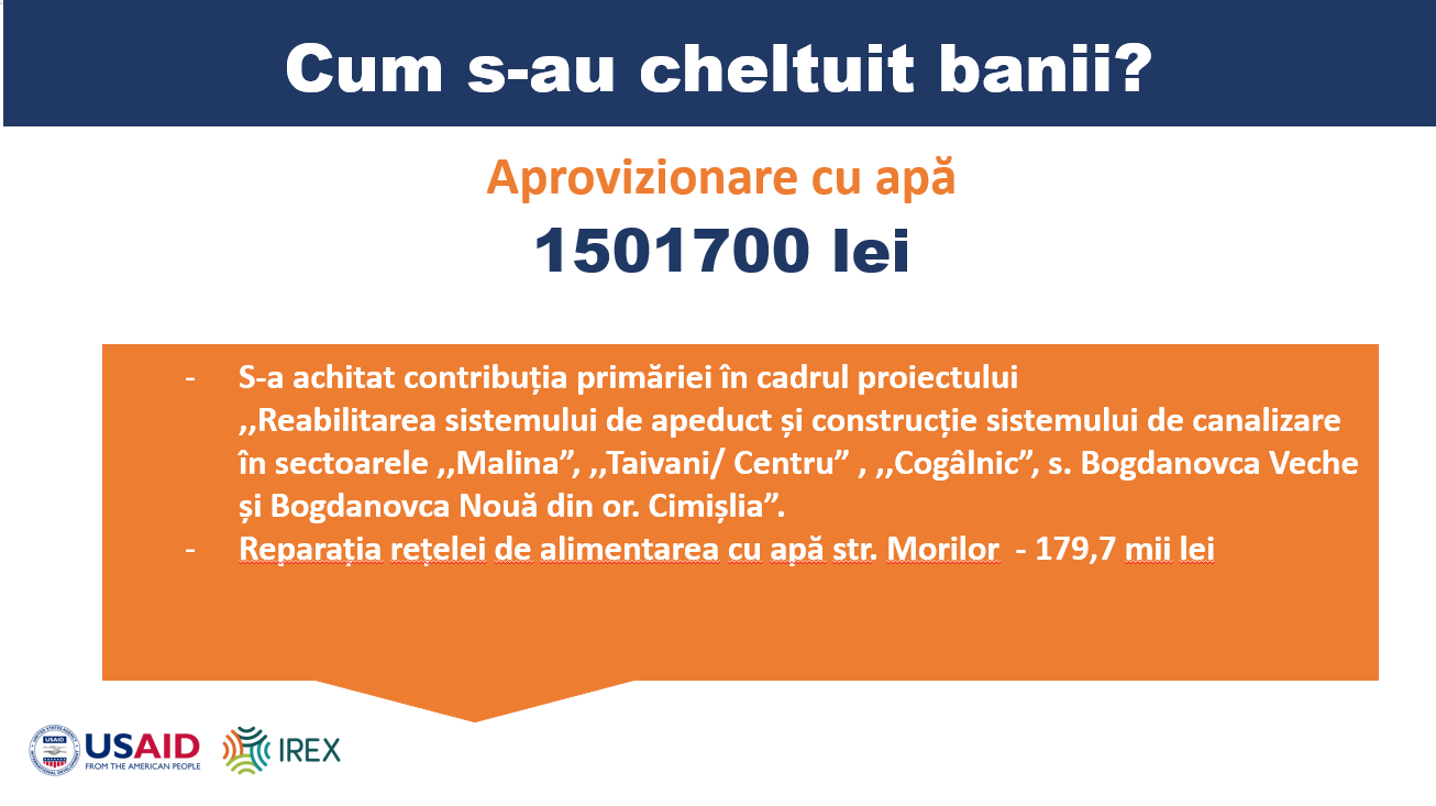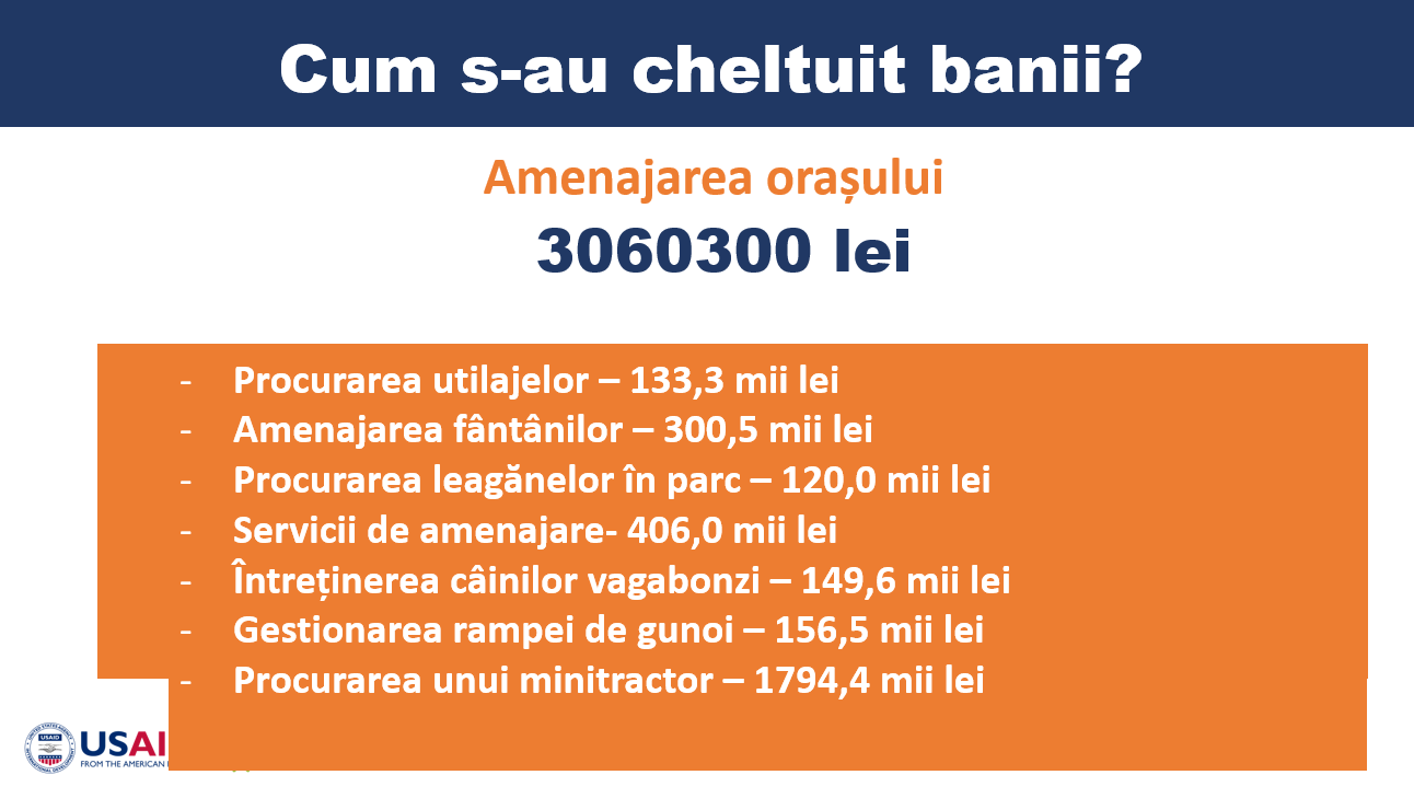 Pe parcursul anului, mijloacele bugetare au fost administrate cu responsabilitate și orientate către domeniile prioritare: dezvoltarea și întreținerea infrastructurii, susținerea instituțiilor educaționale, servicii comunale, amenajarea orașului, precum și inițiative sociale și culturale.