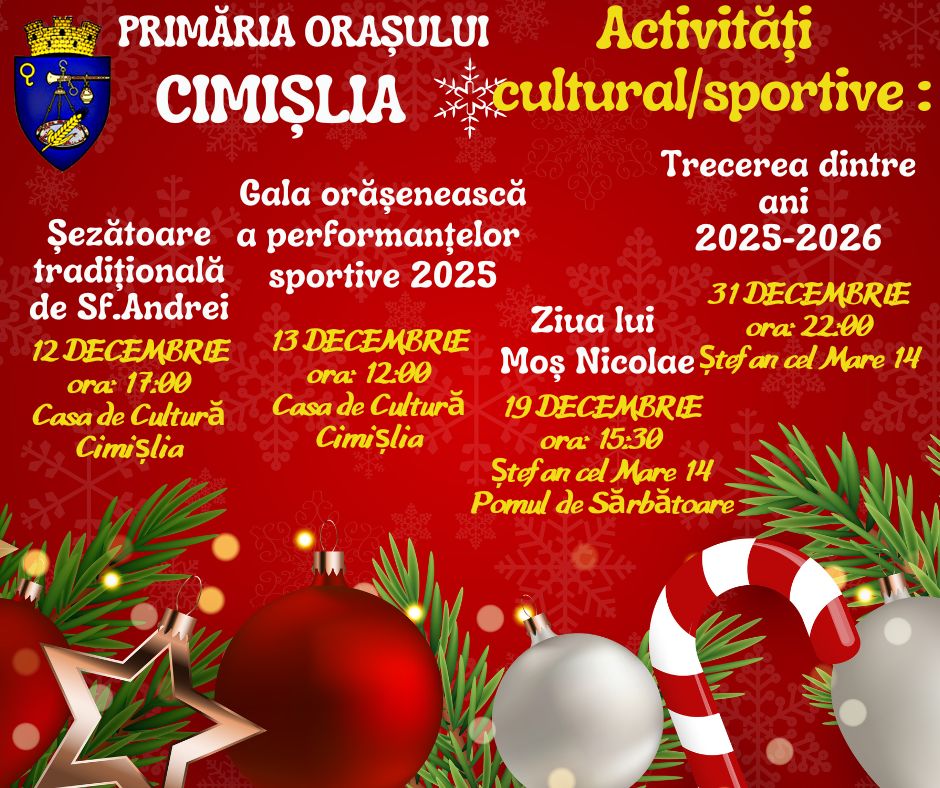 „Primăria Cimișlia vă invită la evenimentele culturale și sportive ale lunii decembrie 2025! Descoperiți programul complet în imagine și haideți să celebrăm împreună spiritul sărbătorilor.”